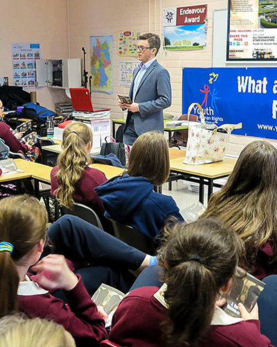 Human Rights-leder engasjerer elever på en katolsk skole med undervisning i menneskerettigheter.